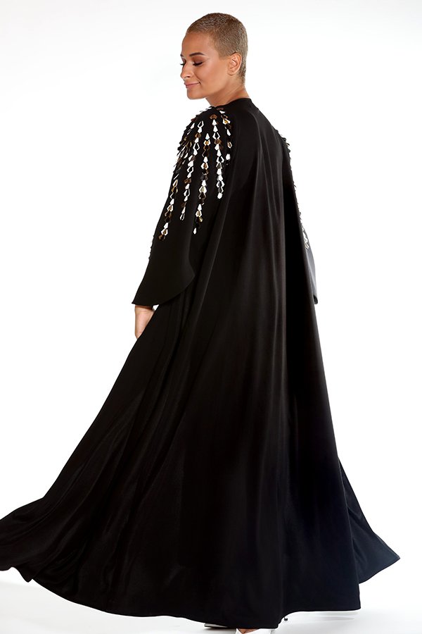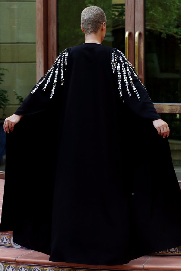 Mikado Abaya in an Un Symmetrical Modern Lapel Carring a Jumbo Handmade Pointed Button