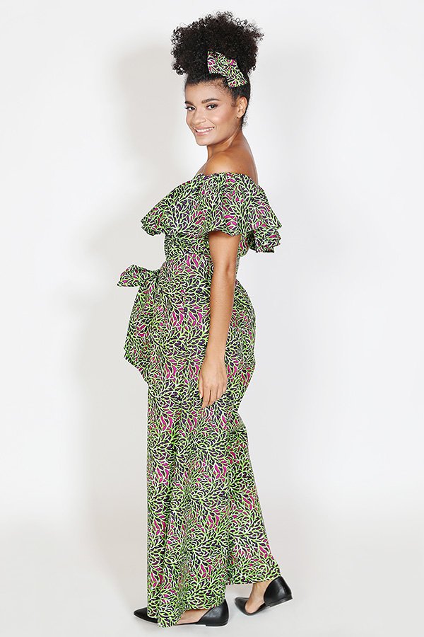 Low shoulder raw silk jumpsuit blended with leather sleeve and jumbo wide leg cut