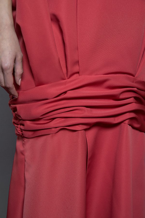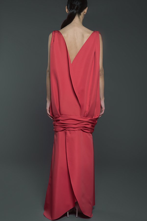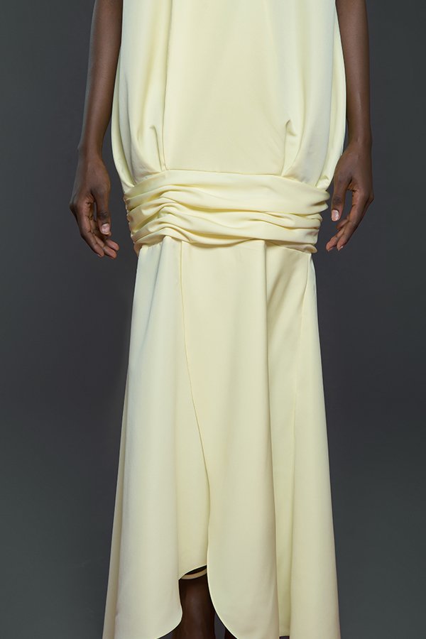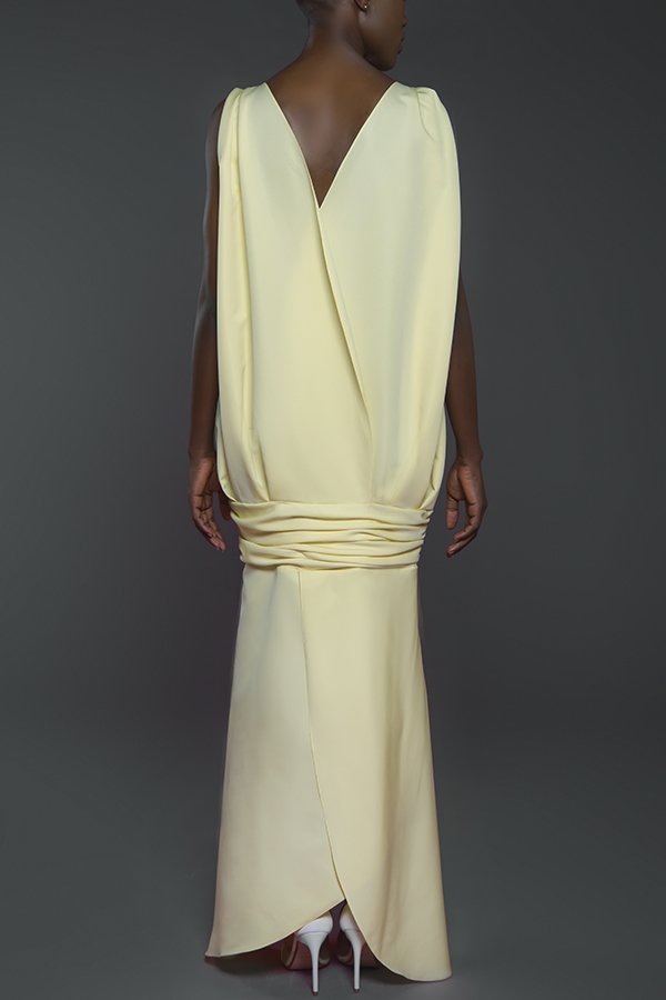 Double overlapping petals structured sleeveless maxi dress with cinched under hip detail