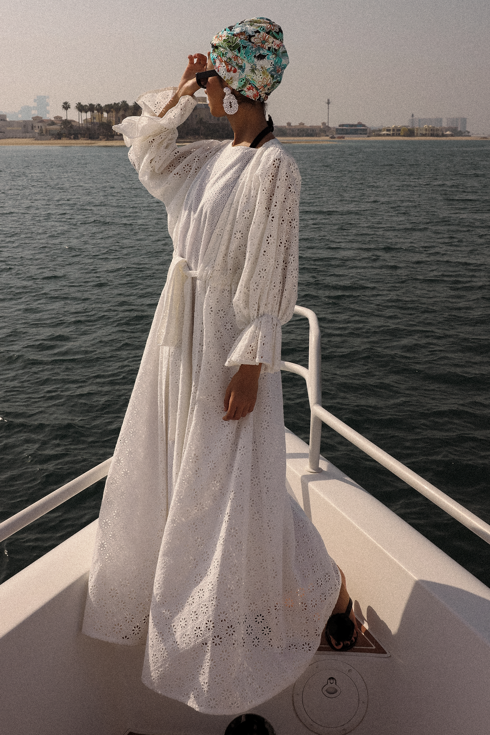 Fleuri Eyelet High Neck Dress with Back Neck Tie