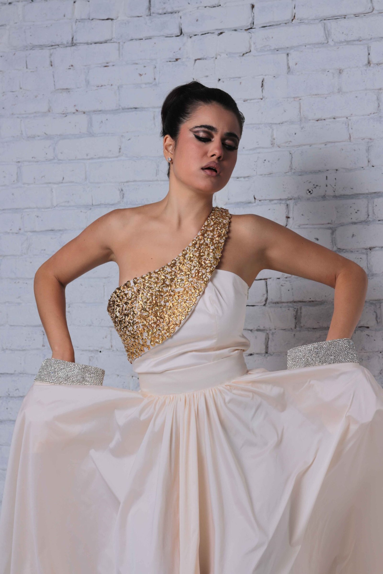 One shoulder paisley shaped top with metal embellishment and crystals