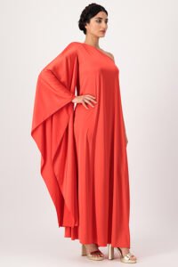 Crepe Silk Kaftan in Mariposa Cut and Slitted Sleeves with One Shoulder 3D Embellishment
