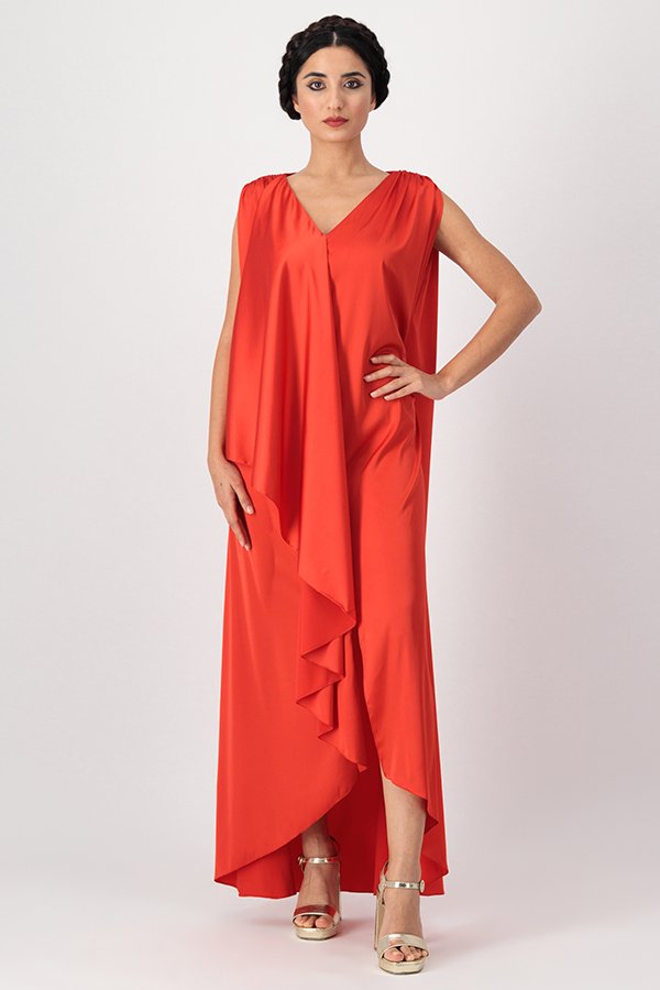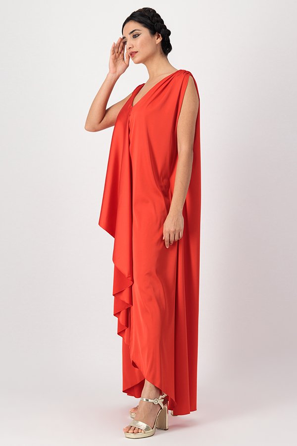 Sleeveless silky crepe kaftan with long frilled collar